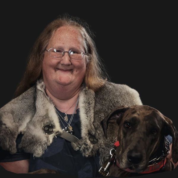 Meet Brew! Brew is a Great Dane and is Hope's SA. Brew helps with mobility for her POTS (postural orthostatic tachycardia syndrome) and alerts to it as well. She also alerts to low / high sugar and anxiety. She is dual trained for therapy work when Hope stable. So when you see her please don't forget to ask if she can be pet before you reach out :)