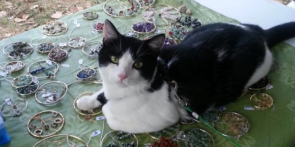 They were our crystal kitties that have crossed to the other side (2020 and 2021) . They used to help us with the energy work we offer. They loved to come to the shows and share their love with everyone :) They wore their own crystals and orgonite made by Show me Orgonite! They loved to be pet and shared their energy . May they RIP. They are missed.